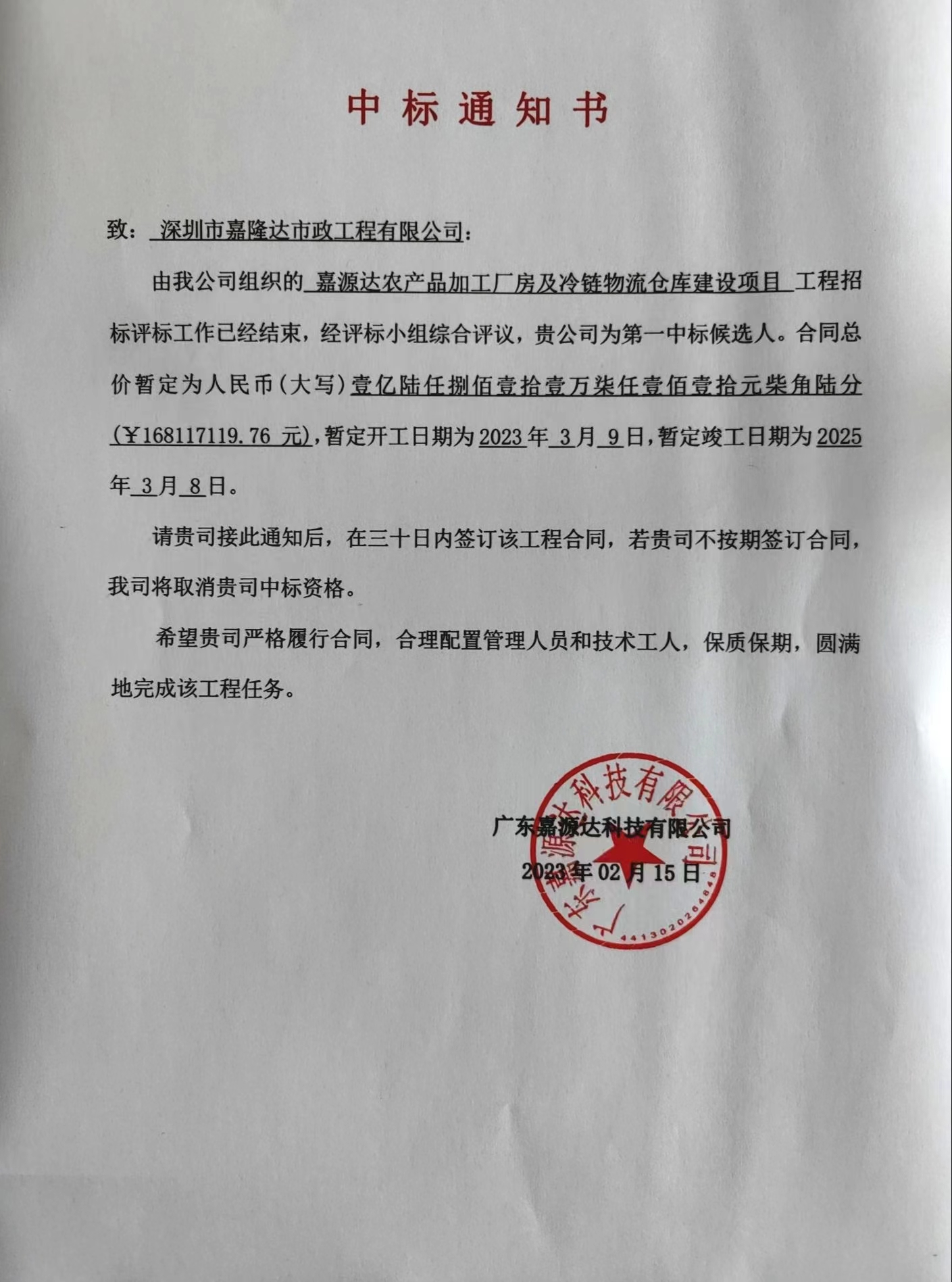 喜訊!公司中標嘉源達農(nóng)產(chǎn)品加工廠房及冷鏈物流倉庫建設(shè)項目